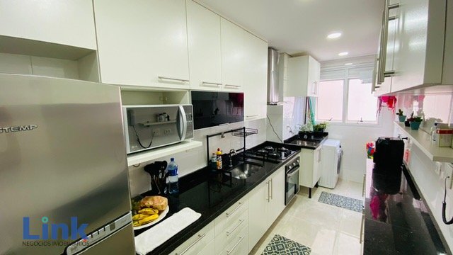 -Cozinha: móveis planejados, eletrodomésticos embutidos, pia e bancada em mármore, coifa, fogão cooktop ,forno elétrico embutido, geladeira, microondas e máquina de lavar lava e seca. Tanque e bancada da lavanderia em mármore.
