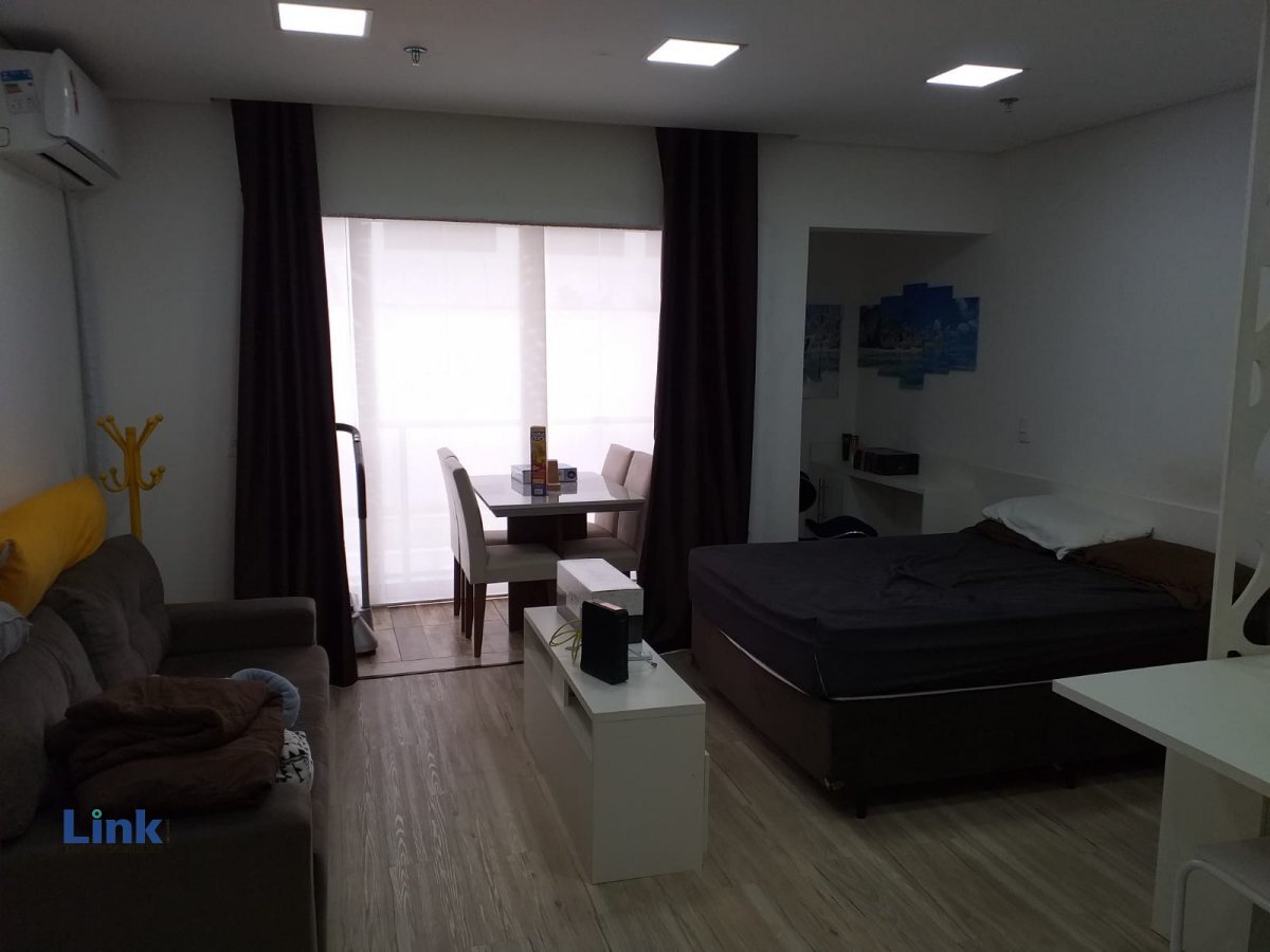 Apartamento tipo Studio com 42 m², 1 banheiro social, totalmente mobiliado, cozinha planejada, gabinete no banheiro, chuveiro, box, armário na sala, quarto + depósito privativo.